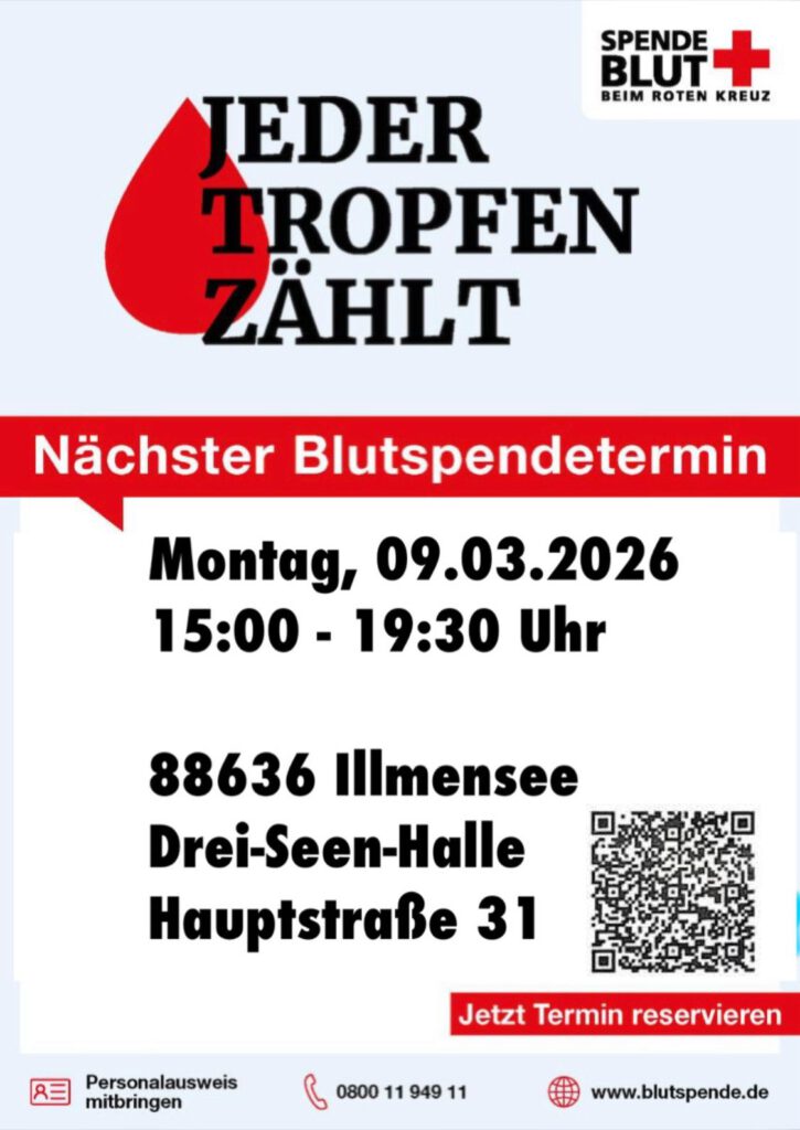 Am Donnerstag, den 4. September 2025, durften wir 124 Blutspender und Blutspenderinnen in der Drei-Seen-Halle begrüßen. Darunter waren erfreulicherweise 3 mutige Erstspender*innen. Am Ende des Tages konnten wir dem Blutspendeteam 119 Blutkonserven zur Weiterverarbeitung mitgeben. Ein besonderer Dank gilt der Gemeinde Illmensee für die...